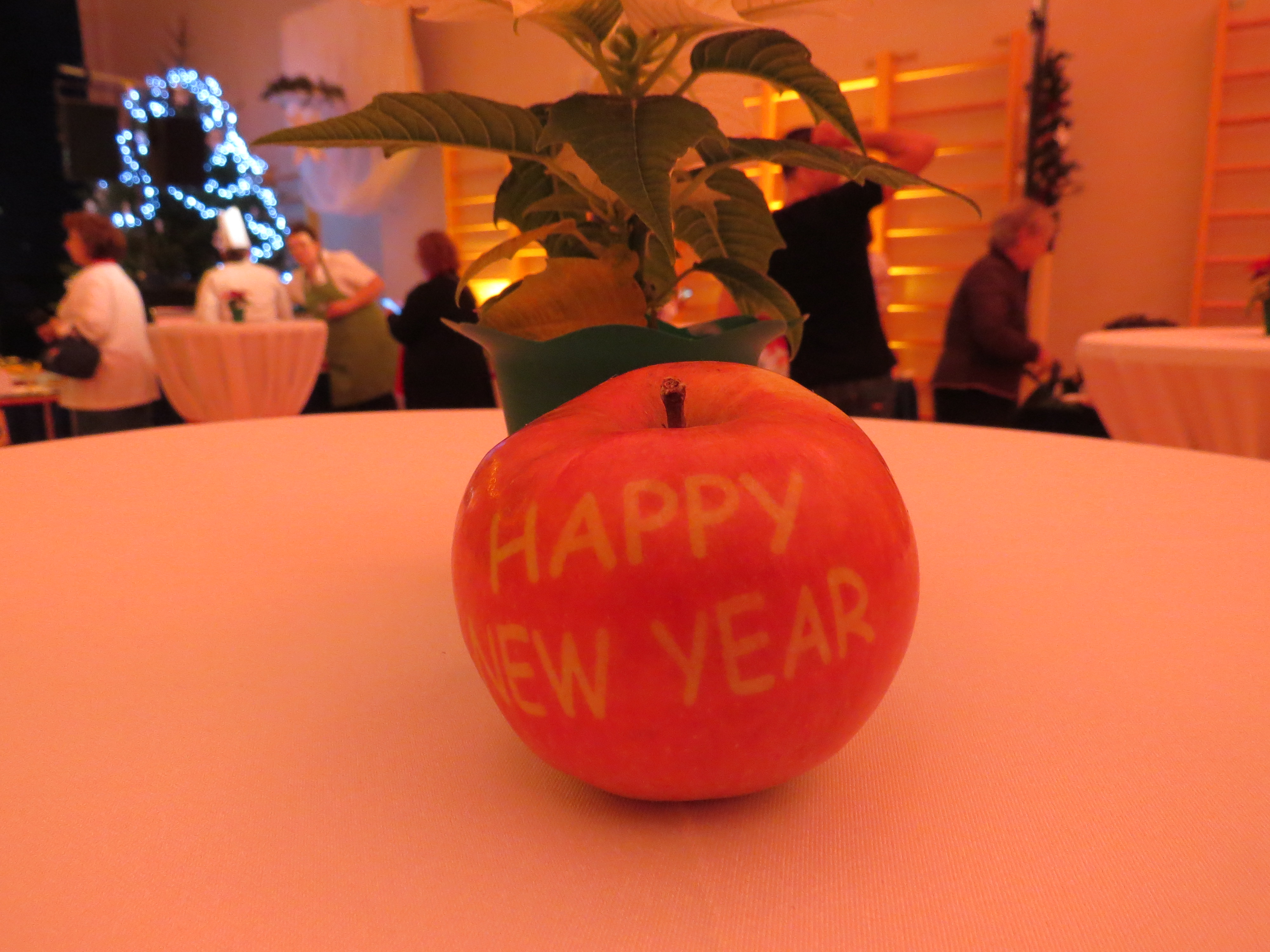 At the European buffet on December 4th the organisers had a bright idea to wish a Happy New Year to their fellow diners in a very simple way: take a nice apple, write ‘Happy New Year’ on it and there you are!