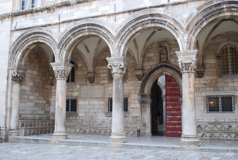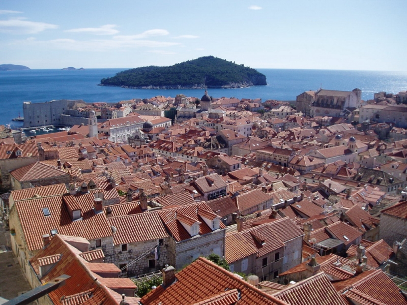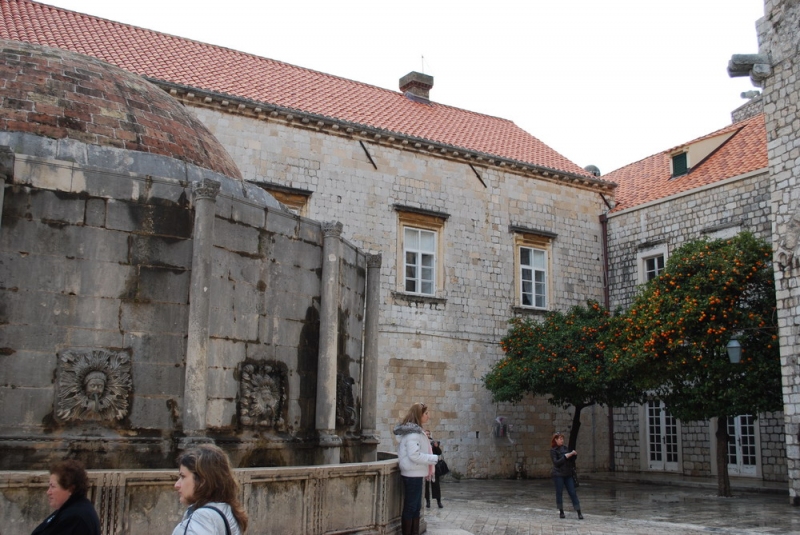 A guided tour of the Old Town of Dubrovnik had been laid on for the afternoon, and the rain took mercy on us and stopped for the rest of the day. Our erudite guides selected for us the best tourist attractions, including Onofrio’s fountains (at which during the plague you had to wash well before you were allowed into the city), Europe’s oldest pharmacy which had once belonged to the Franciscan monastery, the cathedral with its many accretions over the centuries, the Rector’s palace which used to house the Ragusan** government in an odd system whereby the Rector was elected for just one month, during which time he was kept prisoner in his own palace! We then moved away from the main road and onto the Prijeko (meaning ‘beyond’ and recalling the time when an arm of the sea, since filled in, used to run along here) and its network of narrow streets with aerial clothes-lines, one of them, the Zudioska (Jews’ street) containing a minute but still-functioning synagogue. Our guide pointed out the ingenuity with which the citizens repaired the city’s red-tiled roofs after the ‘aggression’ – by placing the bright red new tiles below the surviving old tiles so that the attractive ancient patina is still visible. But I shouldn’t be giving the game away – come in November to see it all for yourselves!