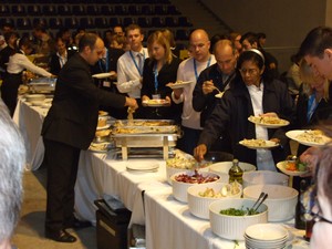 La restauration était assurée par des deux buffets installés parallčllement de maničre ą permettre au maximum de convives de pouvoir se servir "en tandem" sans trop devoir attendre. Cela a bien fonctionné dans l'ensemble mźme si la variété des mets proposés ne pouvait rivaliser avec de la gastronomie.