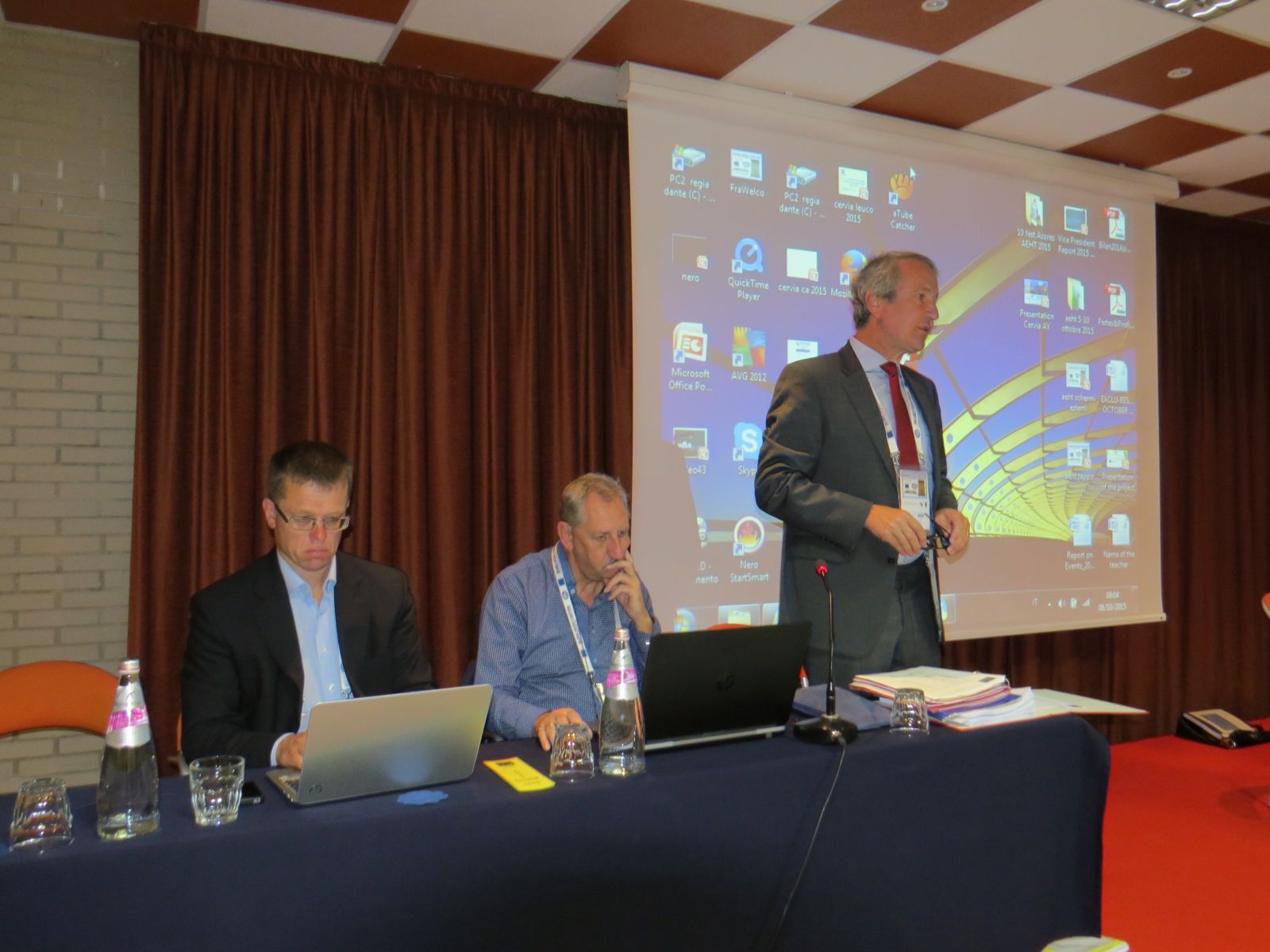 La salle " Caronte " de l'hôtel Dante a accueilli le 8 octobre à 9h l'assemblée générale de l'AEHT, 28ème du nom. Devant un parterre d'auditeurs relativement clairsemé, Ana Paula Pais présidente avait à ses côtés ses vice-présidents Neeme Rand, Herman Siebens, Klaus Enengl, Bogusia Piénkowska, Nadine Schintgen secrétaire générale et son adjoint Xavier Thien en l'absence de Remco Koerts vice-président occupé par les concours.