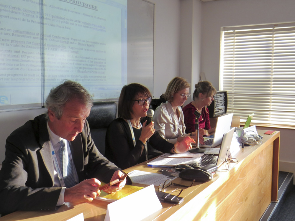 D’autre part la présidente souligne l’importance d’étendre les activités de l’AEHT en direction de « l’enseignement supérieur » pour attirer de nouvelles écoles. Dans ce cadre un prochain séminaire aura lieu au Portugal. Au sujet des élections en 2017, la présidente précise les différents aspects que prendront ces élections, d’une part, pour les représentants nationaux comme pour les candidatures au Bureau. En recommandant à tous de vérifier leurs saisies au niveau de la base de données de l’AEHT ( https://www.aeht.eu/db) .