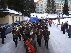 L'inauguration de l'exposition n'a été que le prélude à une après-midi et une soirée chargée. Qu'on en juge. Un cortège avec les officiels escortés par les Krampus et l'ensemble des participants, drapeaux au vent et costumes en vedette s'est rendu depuis l'hôtel Panhans jusqu'au au pied des pistes. Avec en tête la fanfare de Kreuzberg pour rythmer le défilé, haut en couleurs comme il se doit sur une route enneigée. Et les VIP dans une remorque tirée par un tracteur monumental! Un grand moment!