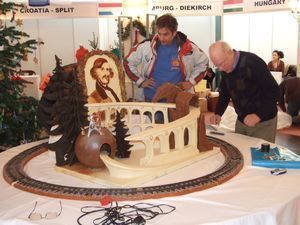 Les fameux viaducs de la ligne de Semmering, classés au patrimoine mondial de l'Unesco ont été reproduits par Günter Prentrup le pâtissier de l'école. Un motif en chocolat sur une idée d'Anna Posch. Avec en complément le train qui va avec. Ici en cours de montage et de réglage!