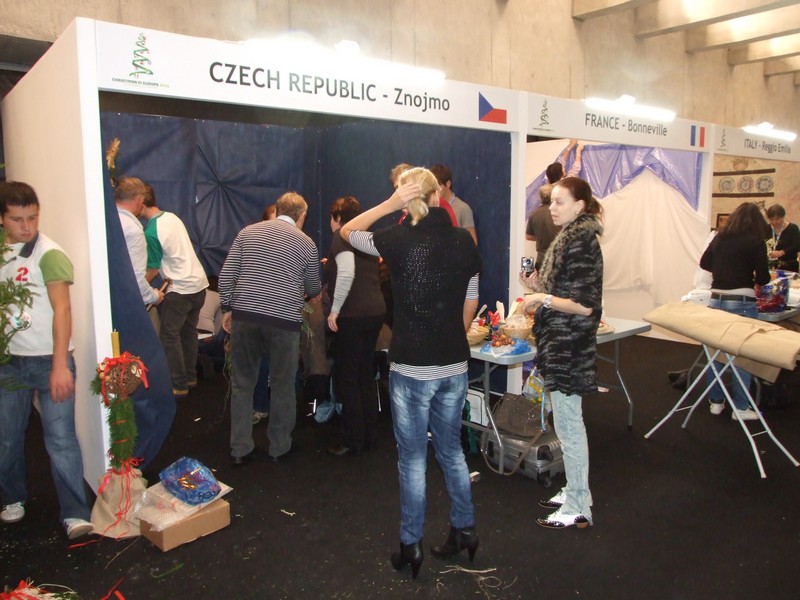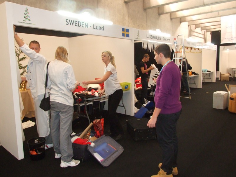 L’INSTALLATION DES STANDS…UN GRAND MOMENT CHAQUE ANNEELe lendemain 3 décembre, après une nuit réparatrice et le petit déjeuner consistant, les délégations ne perdirent pas de temps pour se mettre au travail dans la grande structure du Pavilhao do Mar. Les organisateurs avaient tout prévu : stands aux mesures, petit sapin local appelé « christmas tree ou encore criptoméria », table, chaise et comble de raffinement, une petite caisse à outils dans chaque stand ! On imagine l’ambiance faite de concentration, de rires, de discussions afin de présenter pour chaque délégation un stand attractif et tout simplement beau. Vers midi, les décorations étaient quasiment achevées à la grande satisfaction de leurs auteurs ! Au centre de la salle, une composition locale d’une tradition de Noël pleine de charme. Et des stands occupés par des créations artisanales locales.