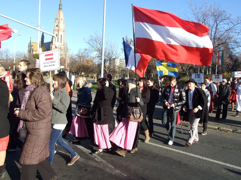 Ce fut à nouveau le cas à Budapest, plus exactement dans l’arrondissement de Köbanya, au départ du Centre culturel où s’étaient regroupées les délégations. Sous un soleil resplendissant mais une température proche de zéro degré la procession s’est ébranlée dans une ambiance bon enfant et sympathique, sous la protection de la police pour éviter un accident toujours possible. Après avoir franchi un grand carrefour, la parade a continué jusqu’à un square pour revenir sur ses pas avant de refluer vers la mairie de Köbanya où un quatuor de professeurs d’une autre école chantait des airs de Noël. Le maire de l’arrondissement Robert Kovacs s’est adressé à la joyeuse troupe en termes chaleureux pour souhaiter à tous un excellent séjour à Budapest et à Köbanya ainsi qu’un joyeux Noël. Avant la photo de groupe sur le parvis de l’église, à l’instigation du quatuor, tout le monde a chanté « Douce nuit sainte nuit » ou plus exactement « Stille Nacht heilige Nacht » ou encore « Silent night, holy night » chacune et chacun dans sa langue. Un moment d’émotion partagée, bien dans l’air de Noël, avant de rejoindre le Centre culturel où les visiteurs des environs se sont pressés en masse autour des stands pris d’assaut !