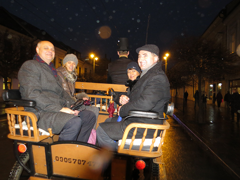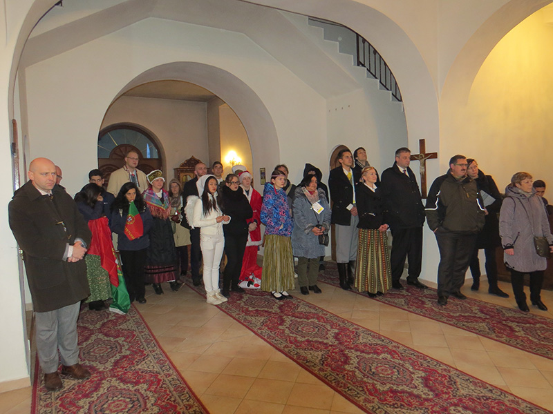 Seconde étape, le temple protestant avec, pour ouvrir le cortège, une calèche pour transporter les VIP à savoir, Ana Paula Pais présidente de l’AEHT, Nadine Schintgen secrétaire générale de l’ AEHT, Jozef Senko directeur de l’école et Marek Sotak son second. Sous le regard parfois éberlué des badauds alors que la nuit était tombée ! Dans le temple, accueil également chaleureux du pasteur, Mgr. Bakafar.