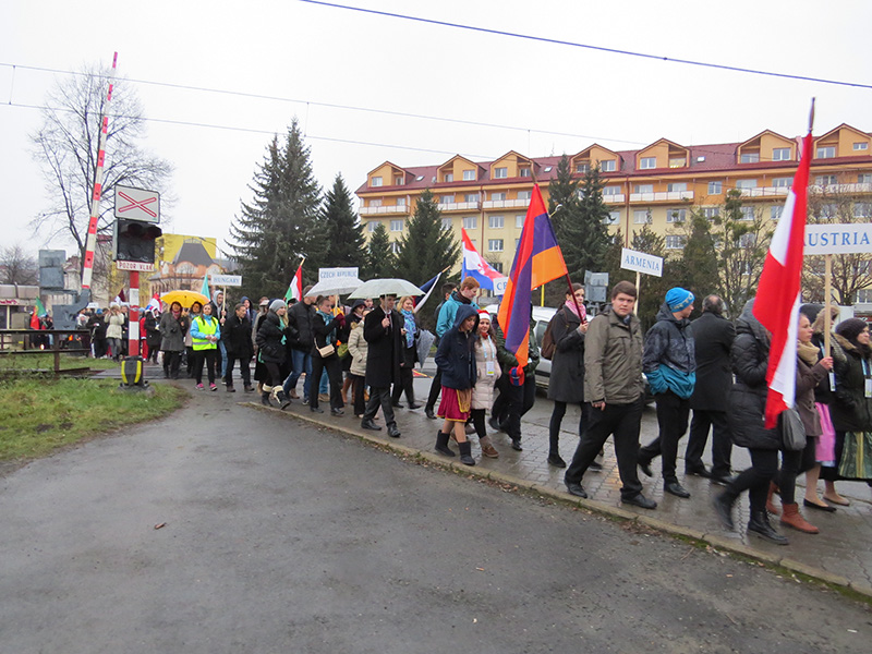 Malgré une pluie fine, la traditionnelle parade des délégations à travers les artères de la ville de Presov a bien eu lieu lundi après-midi 8 décembre au départ de l’hôtel « Linéa » siège des délégations.