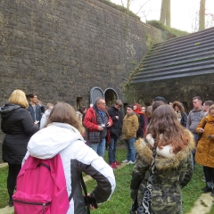Dès potron-minet, rassemblement devant l’église pour l’embarquement dans deux bus, direction la ville de Luxembourg. Pour une visite d’une partie de l'immense système souterrain de défense militaire des casemates de la ville, habituellement fermé au grand-public. Le guide, Romain Schaus attendait la moitié du groupe à l’entrée d’une des casemates située au parc Ed. Klein du centre ville. Très disert, il en fit les honneurs par une promenade dans le dédale des tunnels reliant les ouvrages les uns aux autres. Une véritable leçon d’histoire(s) puisque la ville de Luxembourg fut ballottée par les aléas des conquêtes et reconquêtes.