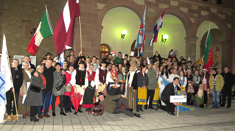 Jeudi 3 décembre, à l’issue de l’inauguration des Noëls d’Europe, il était prévu que la parade devait quitter le Centre culturel à 17h30. Ce qui eut effectivement lieu à quelques minutes près. La parade, précédée de la police a parcouru le centre ville et la zone piétonne pour arriver à 18h devant l’église où devait avoir lieu l’office de Noël. Sauf que l’horaire de cet office prévoyait 19h. Il fallu patienter d’abord à l’extérieur, ce qui permit finalement de réaliser la photo de famille traditionnelle.
