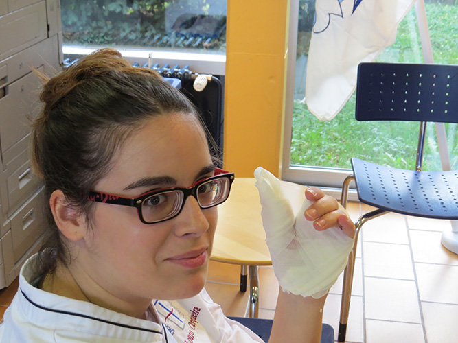 Quand on travaille en cuisine il arrive parfois que l’on se coupe. C’est arrivé à une élève du LTH surprise dans le hall du LTH en attendant l’ambulance. Rien de bien grave, mais ce que l’on ne sait pas, c’est que la police doit obligatoirement être informée en cas de blessure par arme blanche. Dans ce cas, il ne s’agissait que d’un banal accident en cuisine et non d’une rixe sur la voie publique !