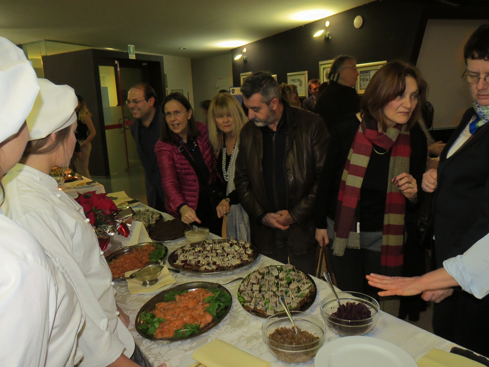 Les deux soirées du 6 et du 7 décembre n’ont pas dérogé à cette tradition et dans le restaurant du 3ème étage de l’école les neuf délégations ( Fatima, Yerevan, Vérone, Maribor, Lisbonne, Lund, Barcelone, Bjelovar, San Benedetto) du premier soir tout comme les huit du second ( Antwerpen, Riga, Podebrady, Orebro, Ponta Delgada, Bled, Senigallia, Diekirch) avaient mis « les petits plats dans les grands » ,offrant ensuite aux convives un véritable tour d’Europe gastronomique.