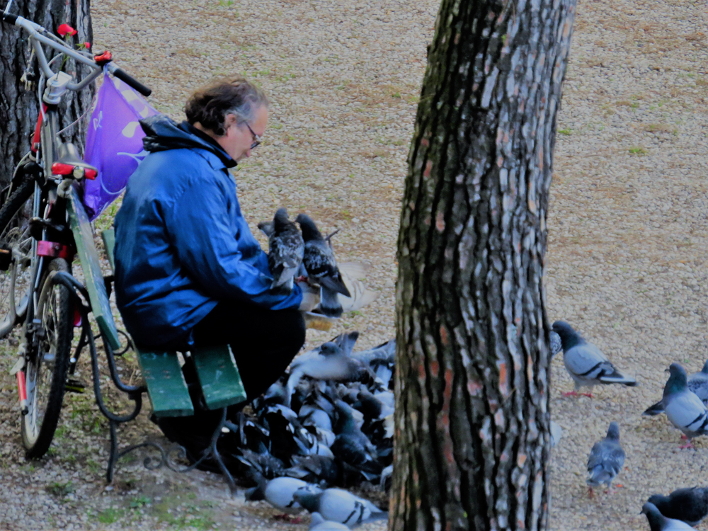 Grâce au téléobjectif, cette scène a été prise depuis un étage de l’hôtel Garden. Un monsieur vient tous les jours donner des graines à une petite escouade de pigeons voraces et plutôt agités !