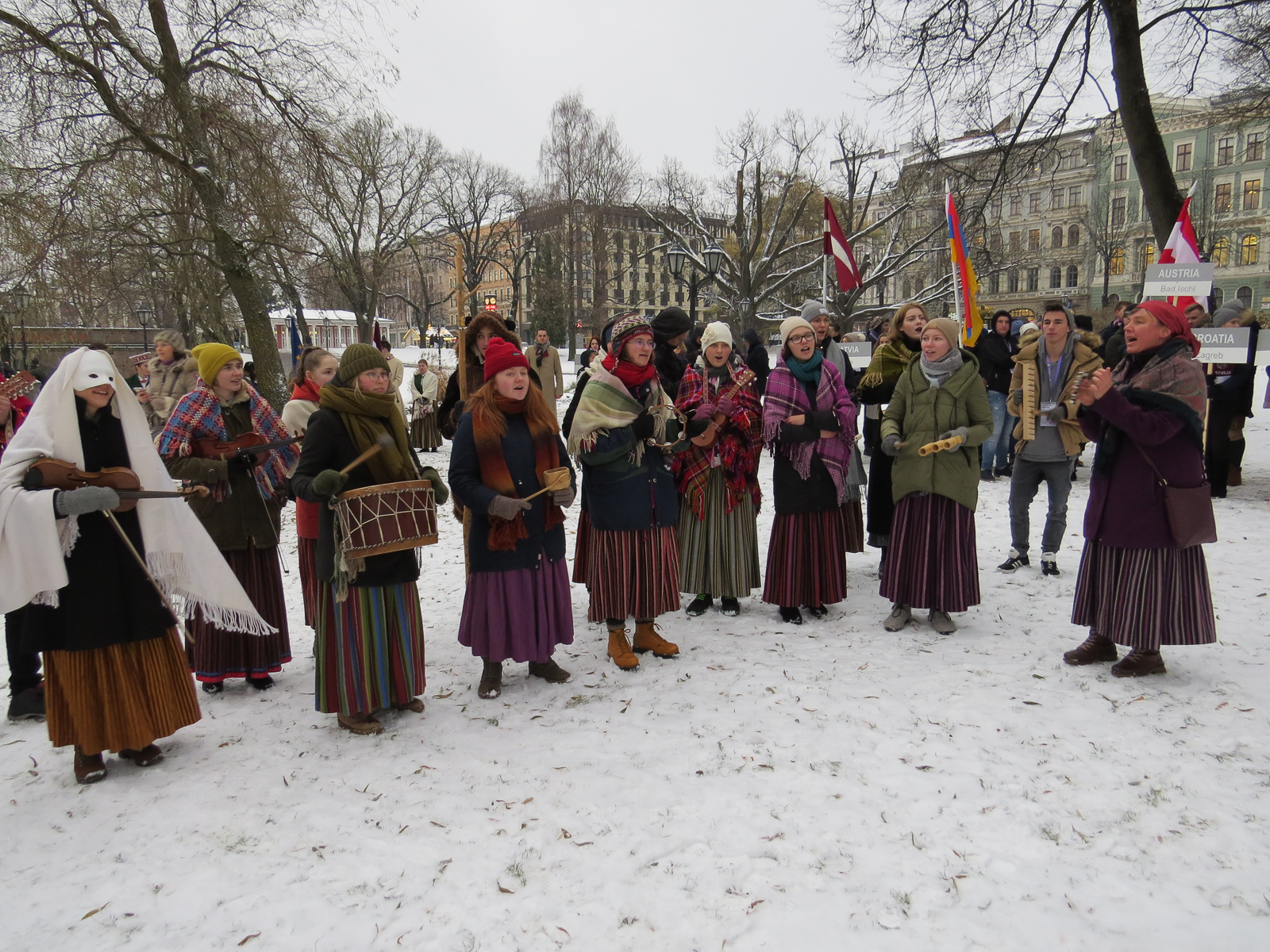 La journée du mardi 3 décembre marquant bien sûr le début des Noëls d’Europe s’est déroulée en plusieurs étapes avec dans la matinée la mise en place pour chaque délégation du stand attribué avec sa décoration et ses divers accessoires. (voir stands). C’est à 13h après un transfert en bus que tous les participants se sont retrouvés, la plupart en costumes, à l’entrée de la cathédrale évangélique luthérienne de Riga où les drapeaux ont formé une haie d’honneur avant de se diriger en procession dans le chœur du sanctuaire, accompagnés d’un jeu d’orgue solennel et puissant.
